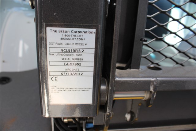 Vehicle is equipped with a Braun Lift 800lb Wheelchair Lift model NCL919FIB-2